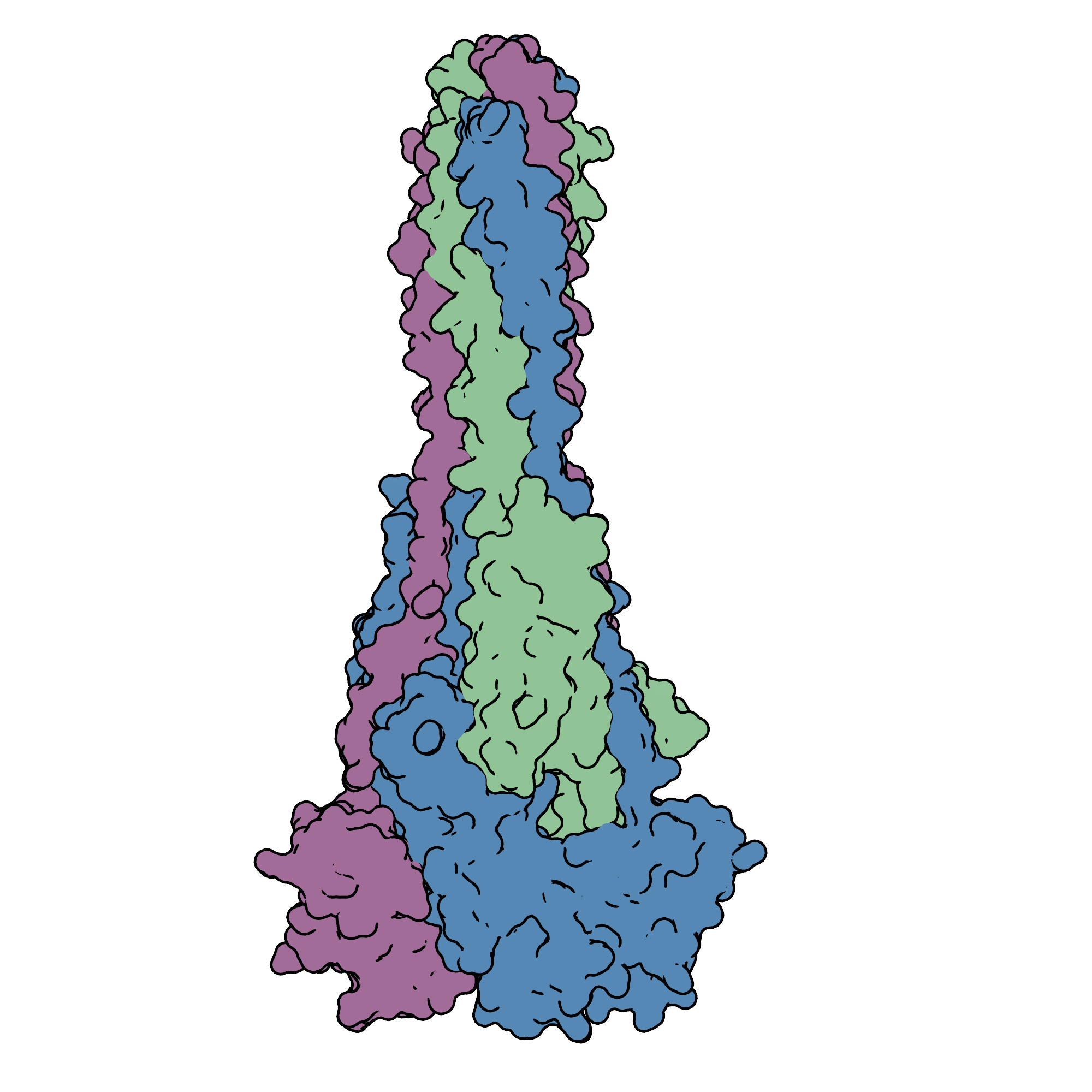 The trimeric fusion protein undergoes a dramatic, irreversible conformational change following triggering. The structure transistions from the prefusion conformation to an extended postfusion conformation. This enables the fusion peptide, located near the top, to interact with the host membrane and results in fusing the viral and host membranes, completing the first step of infection.